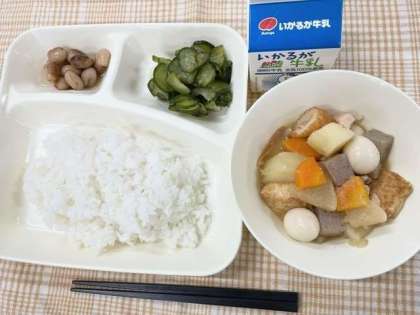 今日の献立は、ごはん・関東煮・きゅうりの梅風味・とら豆の煮もの・牛乳です。