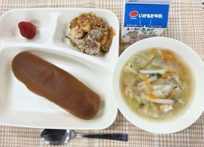 今日の献立は、黒糖パン・とうふのミートグラタン・じゃがいもと野菜のスープ・いちご・牛乳です。