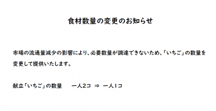 今日の給食では、数量調達不足により提供数量を変更しています。