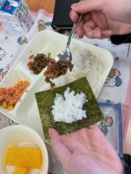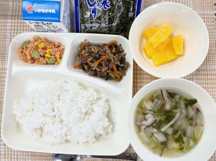 今日の献立は、手巻きごはん(牛肉のコチジャンいため・さけのカラフルそぼろ)・すまし汁・ダイスゼリー(みかん)・牛乳です。