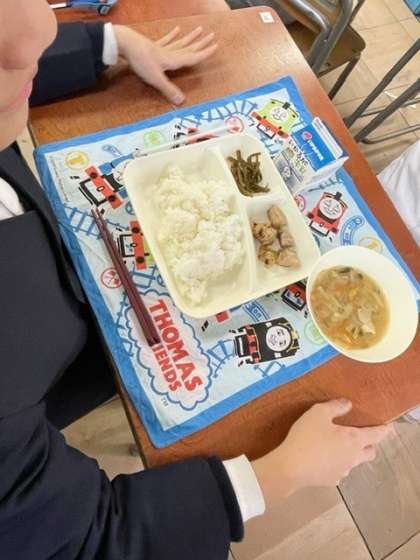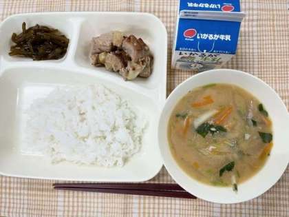 今日の献立は、ごはん・まぐろの甘辛焼き・豚汁・くきわかめのつくだ煮・牛乳です。