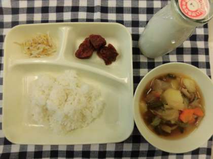 くじらのオーロラ煮、じゃがいもと野菜の煮もの、もやしのゆずの香あえ、ごはん、牛乳 でした。