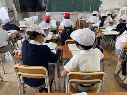 ↓国語科の話し合いを続け、深める学習です。自分の意見と同じ子と(帽子の色で自分の意見を表示)話し合い、意見を深めました。3分以上お話が続き、色んな意見が出ていました。