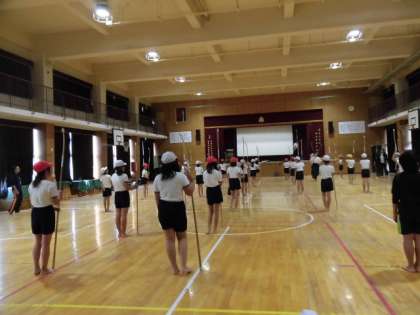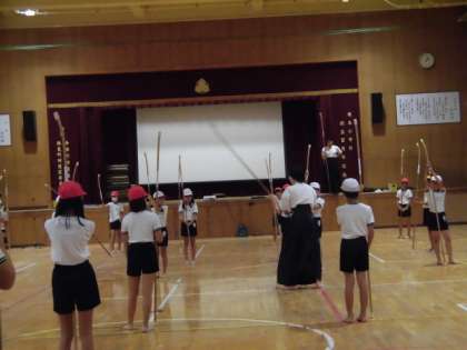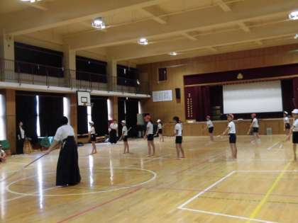 「礼に始まり、礼に終わる」、日本の伝統文化としての「なぎなた」に触れ、子どもたちは背筋を伸ばし、「面、面、面、すね、すね、面!」とお腹から声を出して「打ち返し」に取り組んでいました。