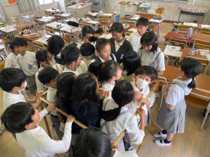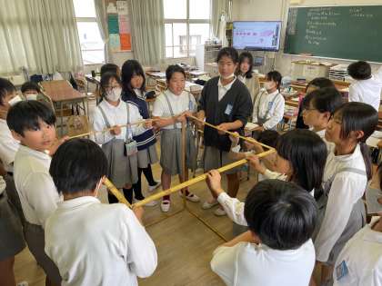 体積の単位量の感覚を養うために、1㎥を作り、1㎥の中に何人入れるかチャレンジしました。実際に作ったり触れたりすることで、量的な感覚を身に付けます。