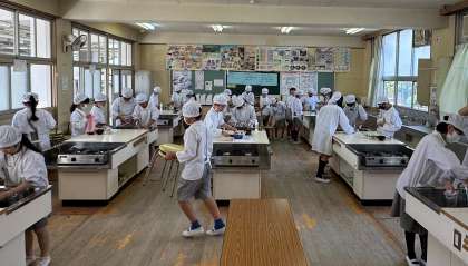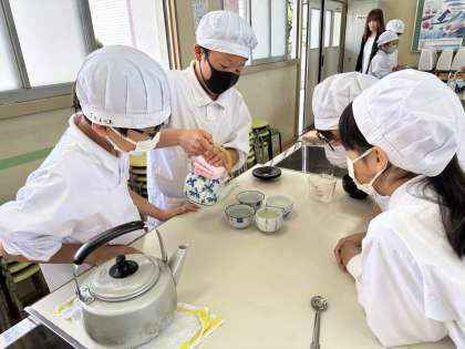 湯を沸かして、お茶をいれる実習です。ガスコンロの使い方からお茶を入れる方法など学習したことを実践しました。いれた温かい日本茶を班でおいしくいただき、苦い!苦いのがおいしい!と感想を言いながら、取り組むことができました。