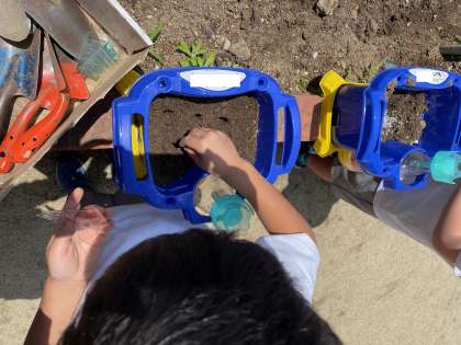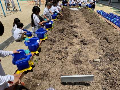 あさがおの種を植える準備をしました。鉢に石を敷いて土を入れて肥料も!土を混ぜたら一粒ずつ種をまきました。毎日お世話をしてきれいな花が咲くのが楽しみですね。