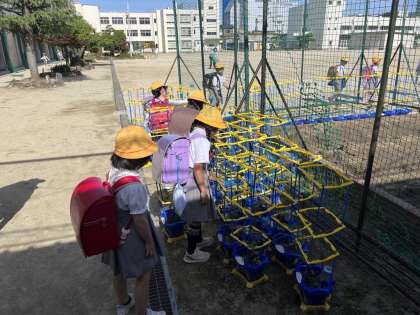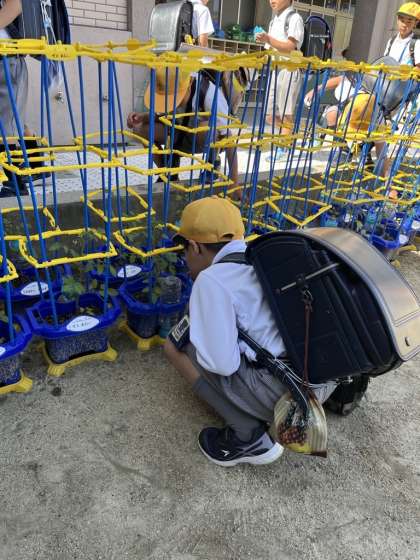 学校に来てすぐに、自分たちのミニトマトに水をあげたり観察したり、愛情をもって育てております。毎日ミニトマトの成長を喜んでおります。