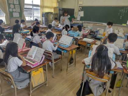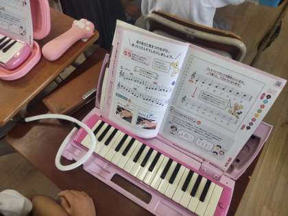 鍵盤ハーモニカが正確に吹けているかを一人一人確認しています。