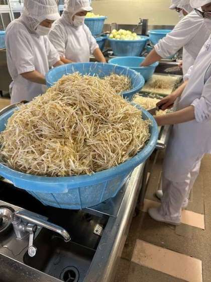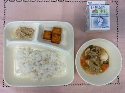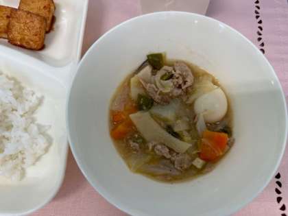 給食では、豚肉、うずら卵、キャベツ、たまねぎ、にんじん、たけのこ、ピーマン、しいたけを使っています。