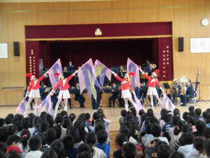 子どもたちの知っている曲も多く、子どもたちは演奏に聞き入りながら、一糸乱れぬカラーガードの演技に見惚れていました。