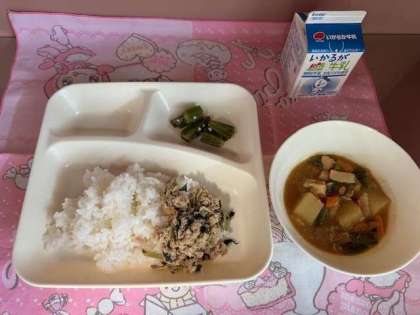 今日の給食では、すっぱい食べものの「梅ぼし」を使った「オクラの梅風味」が登場しました。