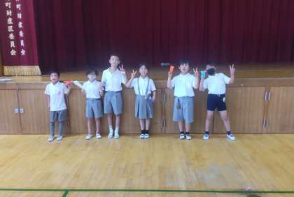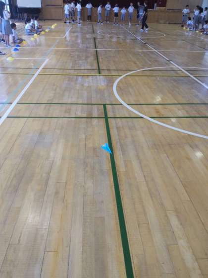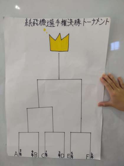 1〜6年の各学年の優勝者が集まって、紙飛行機選手権の決勝が行われました。