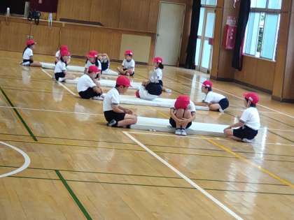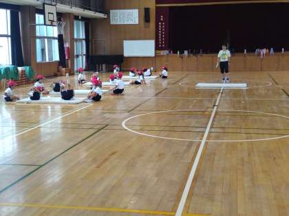 体育館でマットの後ろ回りの練習をしている様子です。