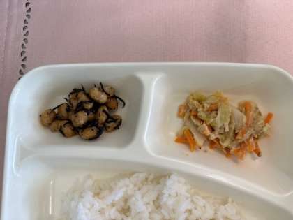 「ささみと野菜のごまみそ焼き」は、新献立です。ささみ、キャベツ、にんじんに、ねりごま、さとう、うす口しょうゆ、白みそで作った調味液を混ぜ合わせ、いりごまをふり、焼き物機で焼きました。