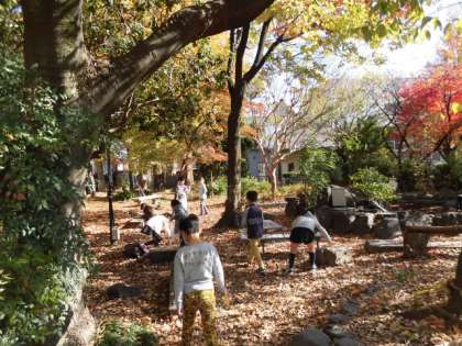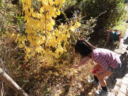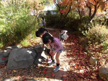 柔らかな日差しが降り注ぐ温かなえの森へ、1年生が落ち葉ひろいにやってきました。班で協力して、いろいろな色の、きれいな葉っぱを集めます。1枚拾っては、「これは何の葉っぱですか?」と聞きにくる子もいます。ケヤキの葉とエノキの葉の見分け方を教えると、自分で葉脈を観察して見分けられるようになる子もいます。