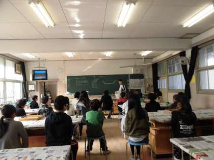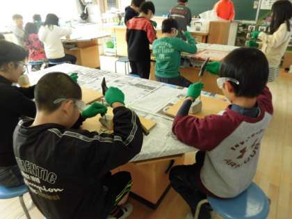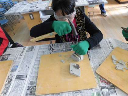 単元は「大地のつくりと変化」。そして今日の授業のメインは、「化石探し体験」です。那須塩原市の「木の葉化石園」より化石の原石を取り寄せ、釘とハンマーを使って化石を探していきます。
