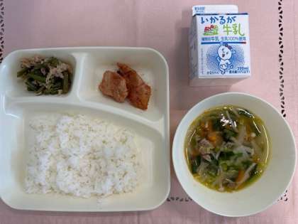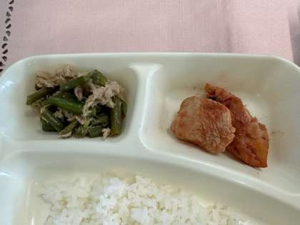 給食では、、しょうが汁、にんにく、砂糖、塩、こいくちしょうゆ、ケチャップ、トウバンジャンを混ぜ合わせて作っています。