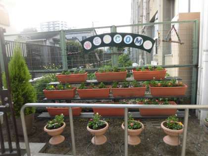 亀池のほとりで植え替えをしていると、子どもたちがやってきて、「ピンクと黄色の組み合わせがいい」「白どうし重ならない方がいい」「あーでもない、こーでもない」などと、花の組み合わせを考えてくれます。最前列の丸いプランターは、子どもたちが考えてくれたとおりに植えてありますので、玄関をお通りの際には、ぜひ、ご覧いただければと思います。
