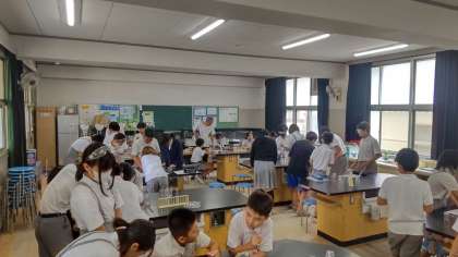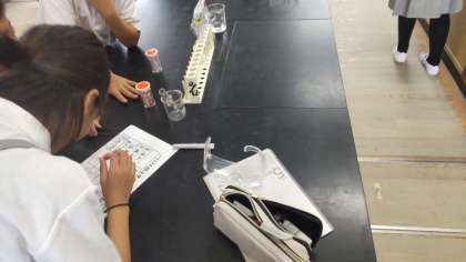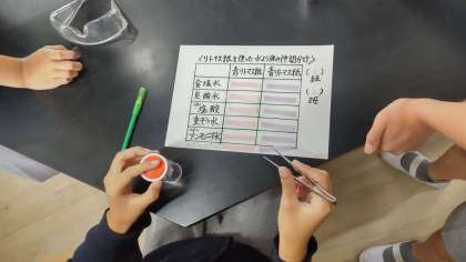 リトマス試験紙を使って、液体が何性かを調べる実験の様子です。