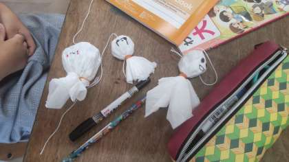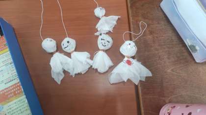 運動会当日は晴れることを願って、テルテル坊主を作りました。