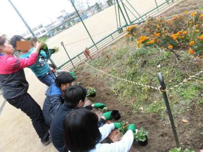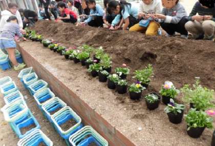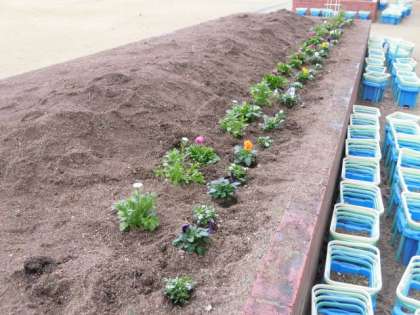 昨日はウエルカムガーデンの植え替えをしましたが、今日は、1年生と3年生が、学習園のふちどりに、色とりどりの花の苗を植えました。