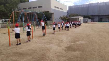 鉄棒運動、ボール運動、走る運動と多様な動きを体験させています。
