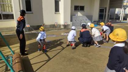 水消火器を使って、消火器の使い方を学びました。