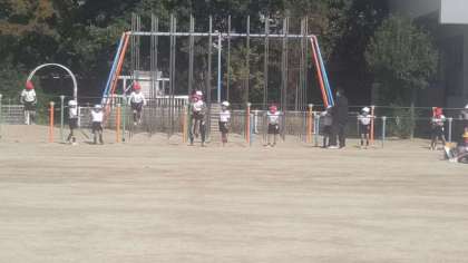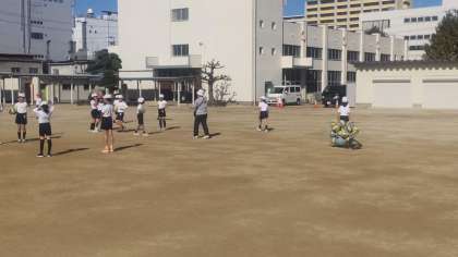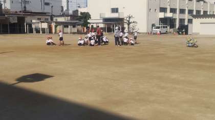 1年生と3年生が、運動場で体育学習をしている様子です。