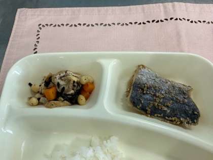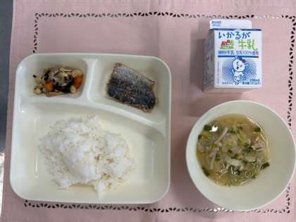 今日の給食のすまし汁と大豆の煮ものには、けずりぶし(さばぶしとにぼしを混ぜたもの)とこんぶでとっただしを使っています。