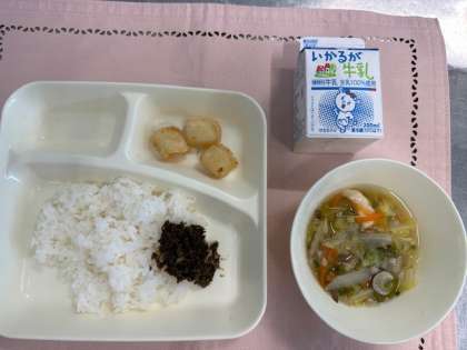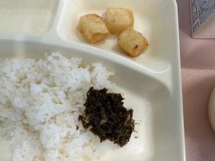 かつおぶし・しいたけ・きざみのりを調味料でしっかり煮詰めた「のりのつくだ煮」は児童に人気の献立です。