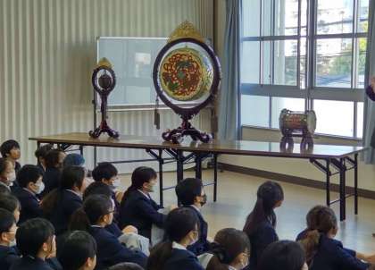 4名の雅楽演奏者に来校いただき、ワークショップを行いました。