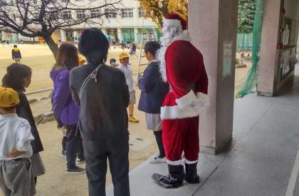 登校時に、玄関にサンタクロースとトナカイがやってきました。