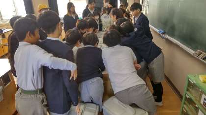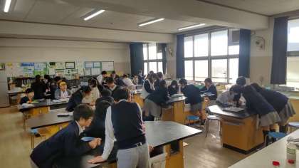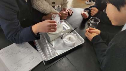 水溶液の実験のために、電子ばかりを使ってホウ酸を計り取っている場面です。