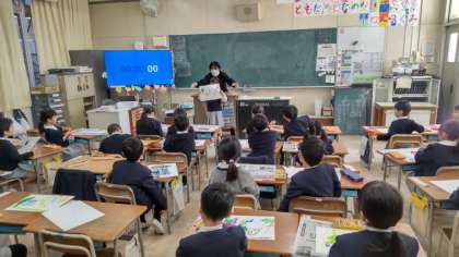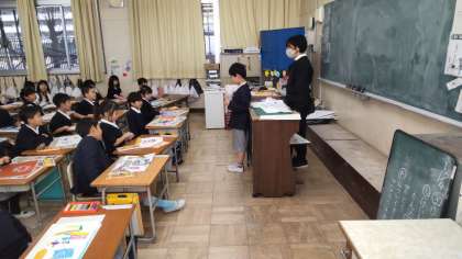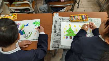 絵で冬休みの思い出を表して、みんなの前で発表しています。