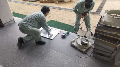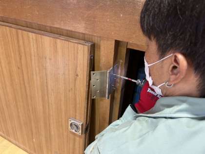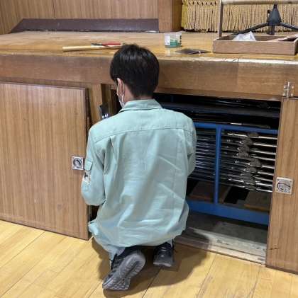 管理作業員さんが、講堂の舞台下の収納庫の扉を修理してくださいました。