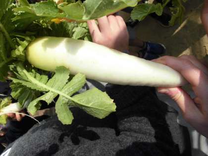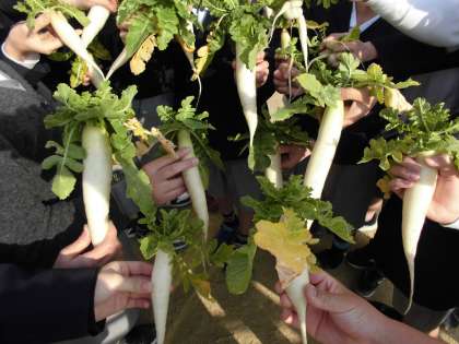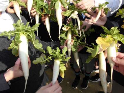 今日は今年度最後の委員会活動でした。栽培委員会では、秋から育ててきた大根を収穫しました。大小さまざまでしたが、子どもたちは大喜びでした。