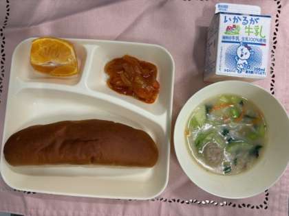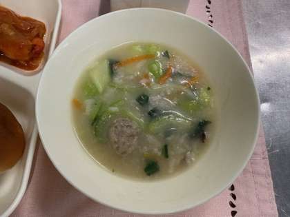 給食の中華がゆは、米のほかに肉だんご、チンゲンサイ、だいこん、にんじん、しいたけが入っています。