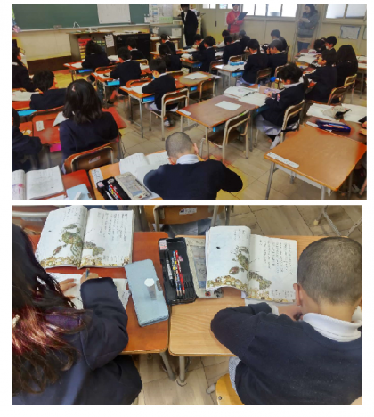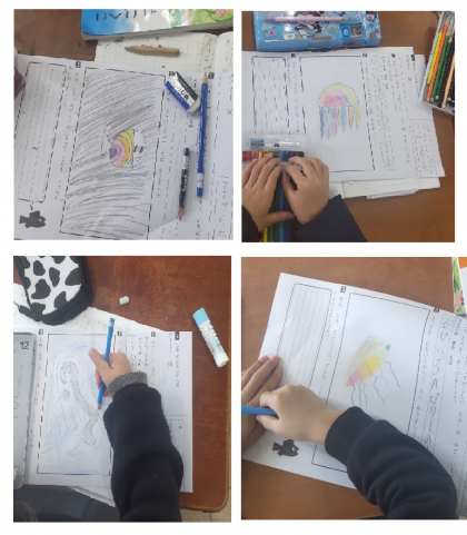 読み取ったことをもとに、海に生き物の絵を描いています。