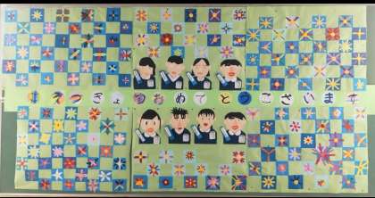 3年生が作成したお祝いメッセージを職員室前の掲示板に掲示しています。