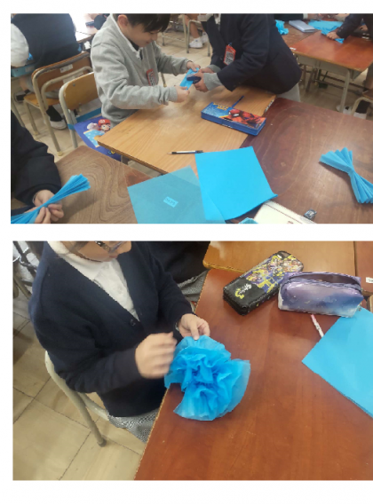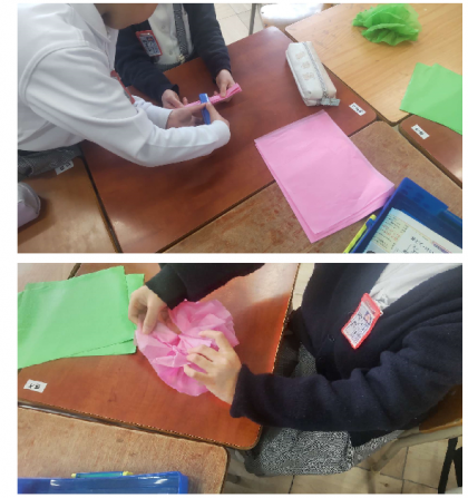 お花紙を使って花を作っている様子です。