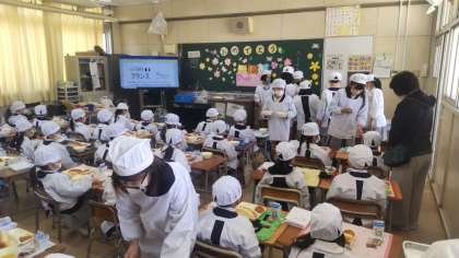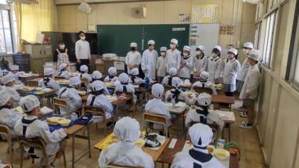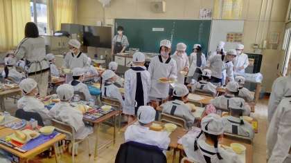 少しの間、6年生に1年生の給食の配膳をしてもらいます。