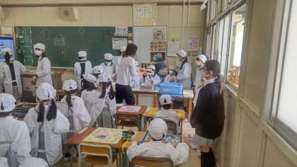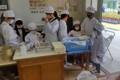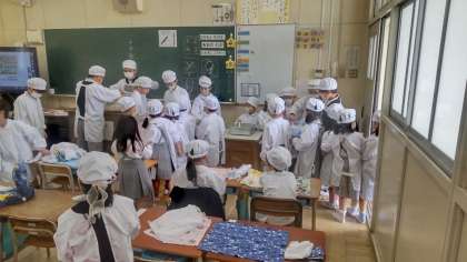 6年生に教えてもらいながら、1年生も配膳にチャレンジしています。