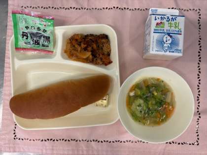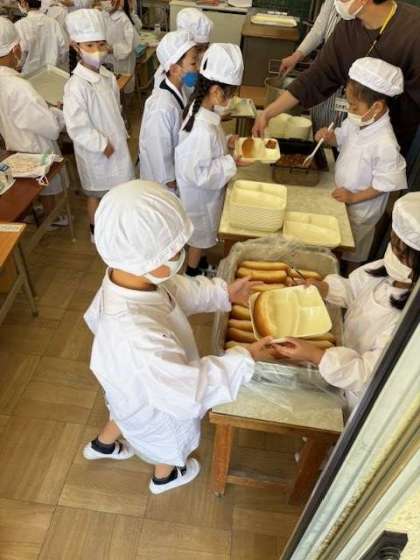 今日は6年生が遠足のため、1年生だけで給食を取りにいき、配膳もしました。