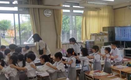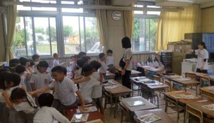 リズムに乗って楽しく「じゃんけん列車」をしている様子です。