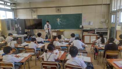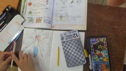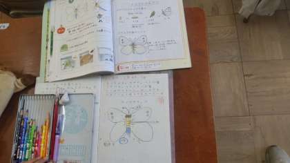 教科書の絵を参考に、ノートに自分で蝶の絵を描いています。