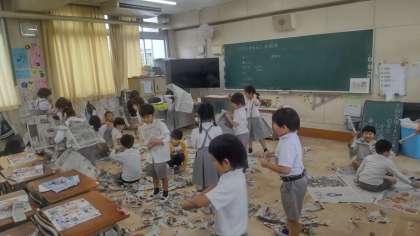 教室中に新聞紙を広げ、新聞紙を自由に丸める、伸ばす、ちぎるなどの活動で作品を仕上げていました。