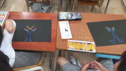 黒い画用紙を使い、きれいな模様のクジャクを描いています。