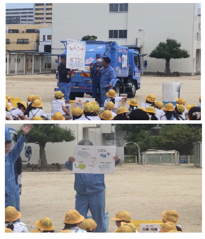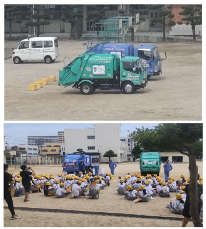 実際のパッカー車を前に、ごみの分別クイズや大阪市の取り組みなどを清掃局の方にお話ししていただきました。