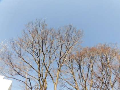冬枯れのエノキの梢を見上げると、雲ひとつない青空です。